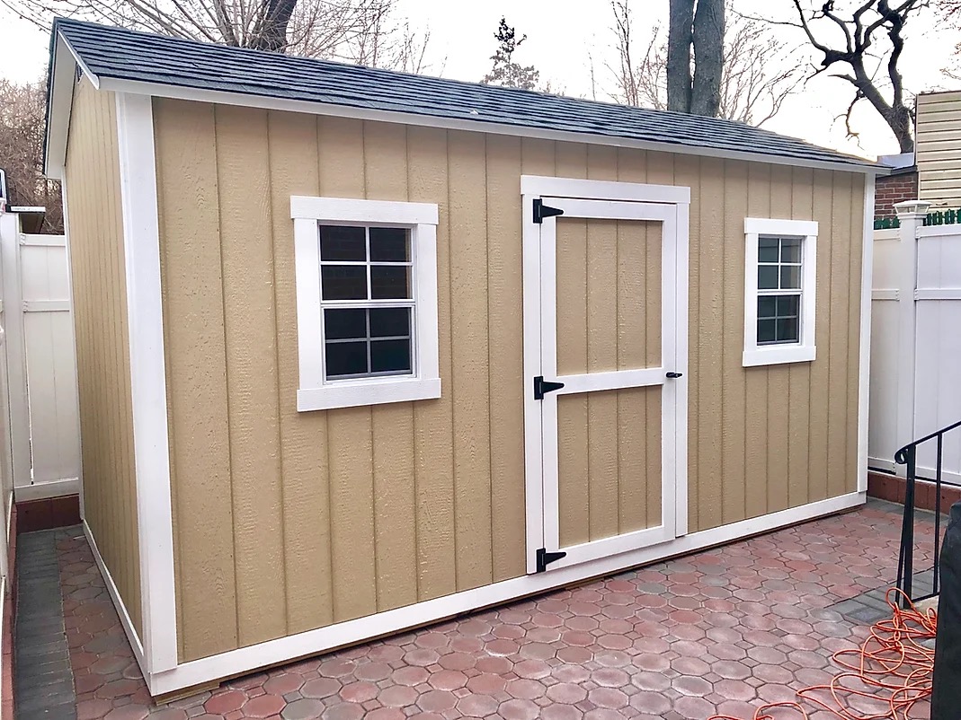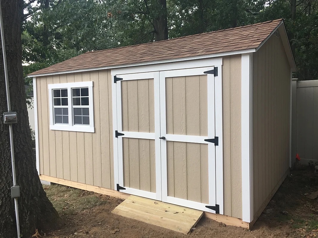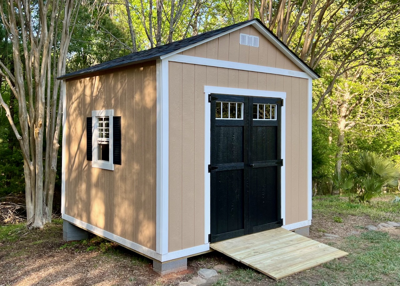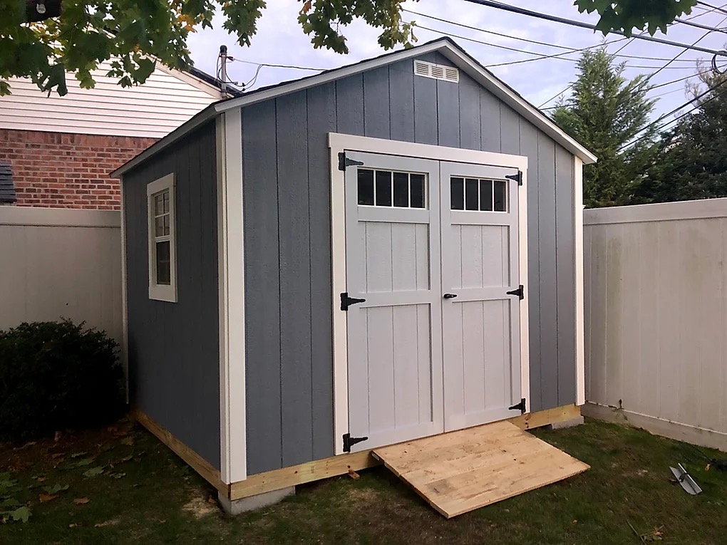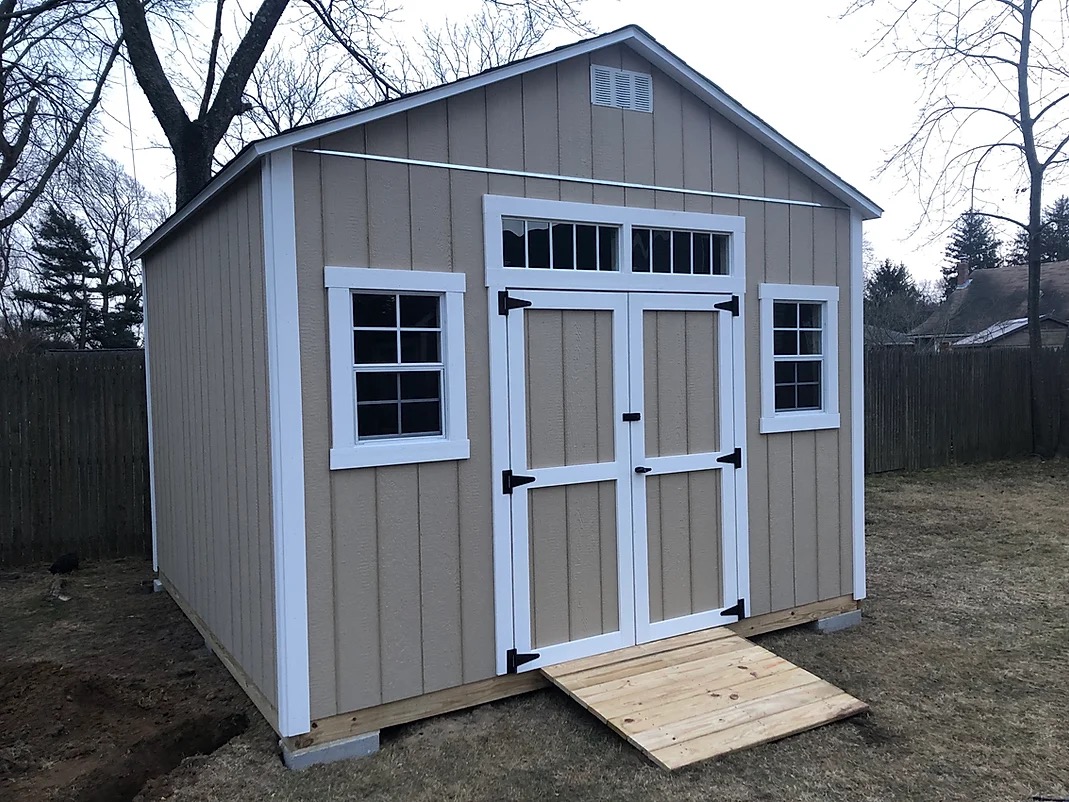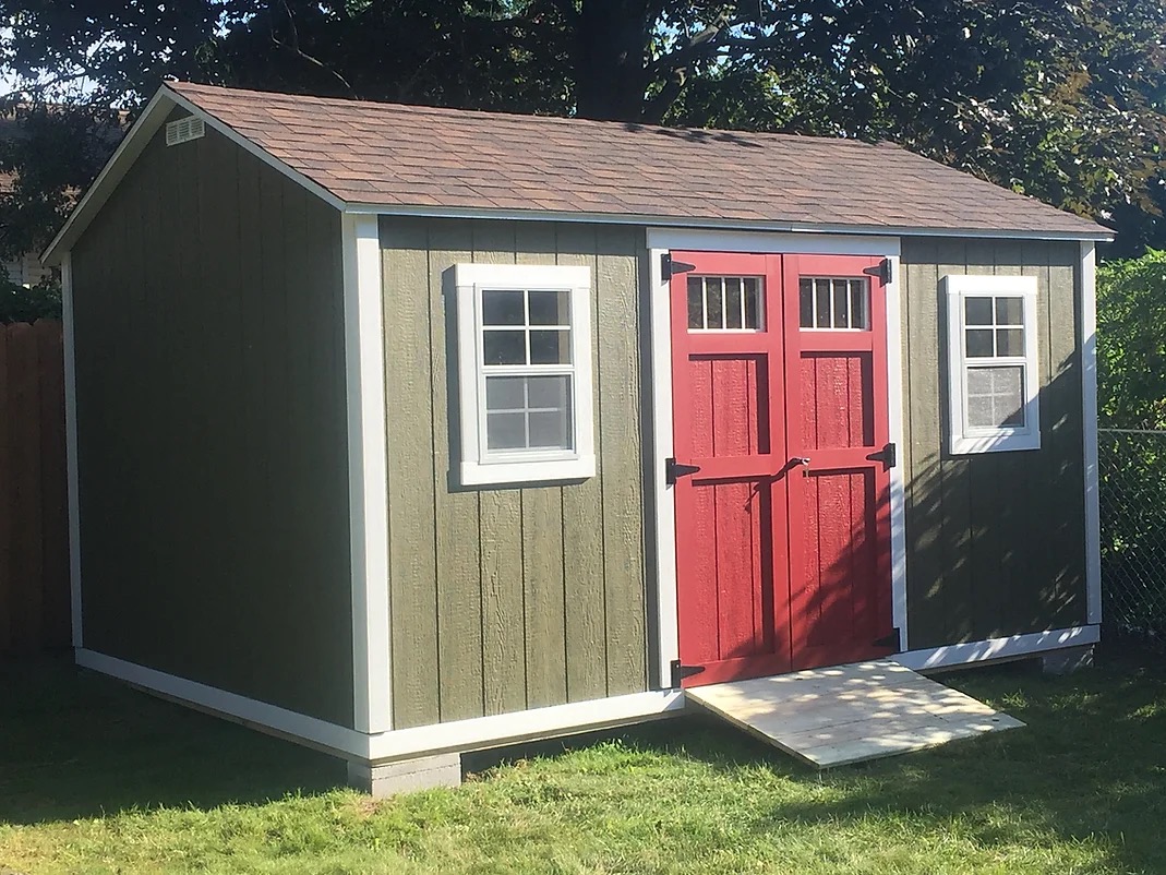 10x10 Shed, Custom Paint + Doors, Transom Windows, Ramp, Extra Tall, Shutters, Bottom Trim